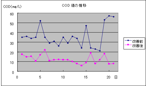 ★改善後、COD値の突然の上昇は、高温の原水の流入に対応。